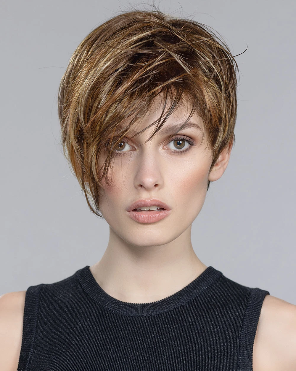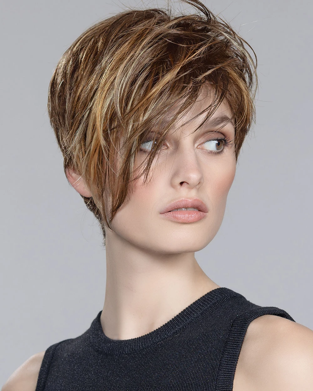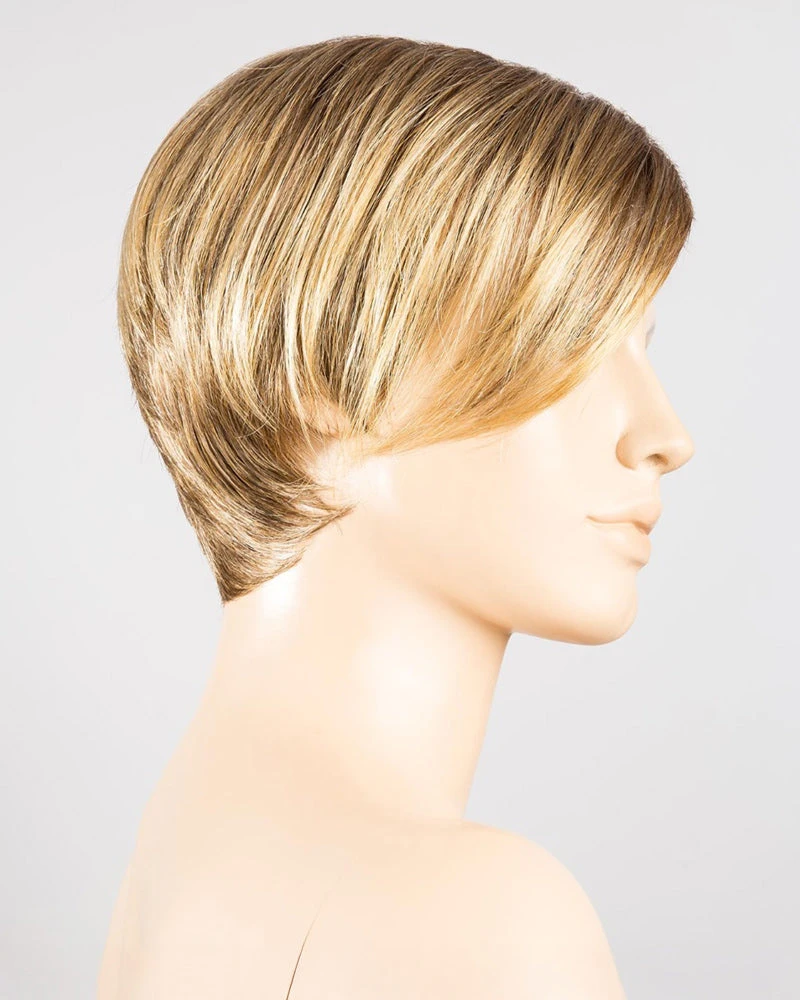 Disc by Ellen Wille is a short, asymmetrical boy cut with a soft, tapered neckline and angled fringe. This modern short wig features a monofilament left-side part, and is ideal for a petite to average head size. The density of the ready-to-wear synthetic hair looks more like natural hair and requires little to no customization or thinning.
