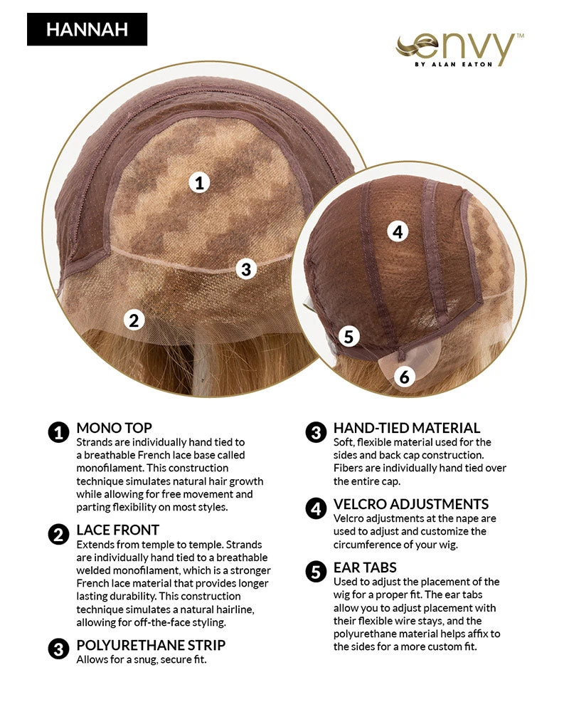 Hannah by Envy is an asymmetrical bob with heavy front fringe. This human hair wig offers fabulous styling versatility. The cap is 100% hand-tied with a Monofilament Top and lace front. These features create supremely natural comfort and movement, a natural looking hairline and the appearance of natural hair growth. Hannah is made of 100% human hair that allows you to style the wig with heat tools as you would your own hair. It looks amazing when styled sleek with its Sides swept bangs or styled with luscious curls. Its available in vibrant multi-dimensional colors. The cap construction is made with built-in poly tabs and strips so that the cap can be secured for better comfort and a more confident fit.