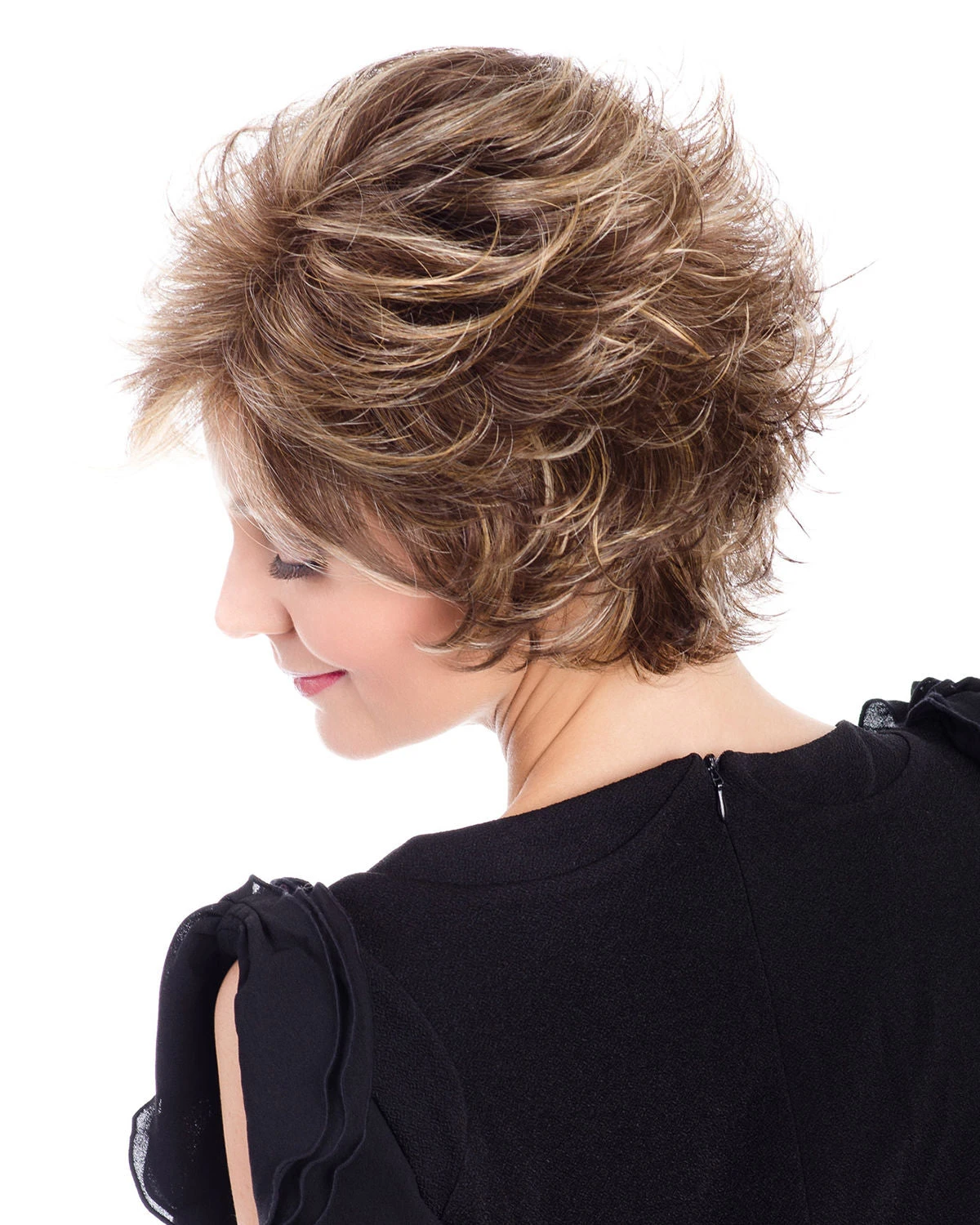 Lacey is a lovely grown-out pixie style with vertical layers that can be worn wispy or brushed up.