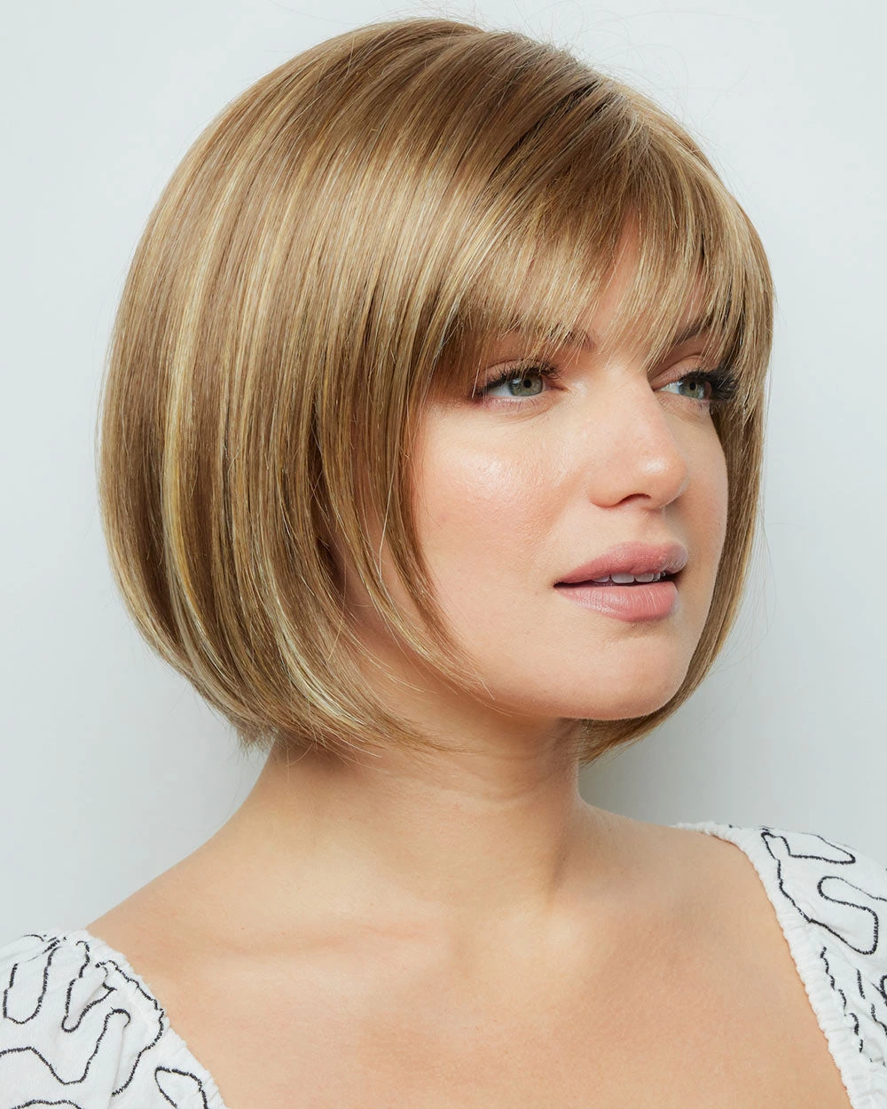 Chin length bob with wispy Bangss. One of our most popular styles!