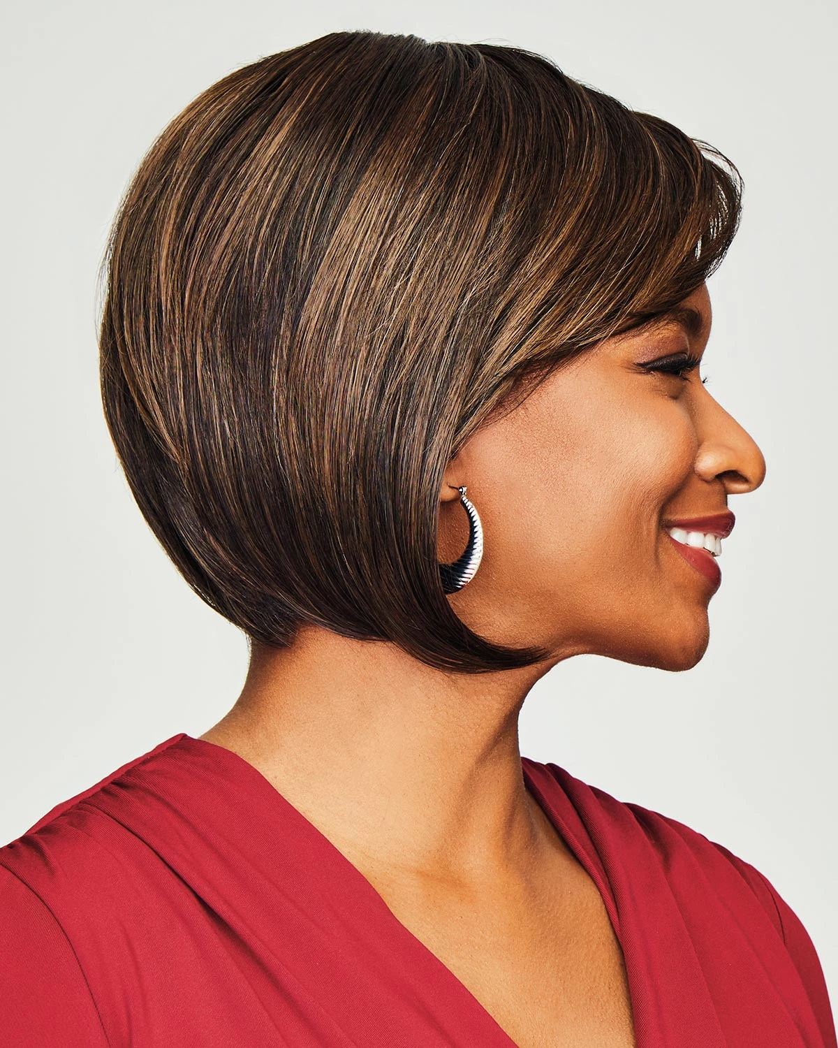 The coveted stacked bob cut is now so easy to achieve. Longer layers frame the face and jawline while the neckline is very short and tailored. With ample volume at the crown and a soft, side-swept eyelash bang, this is the sophisticated cut youll want to wear everywhere.