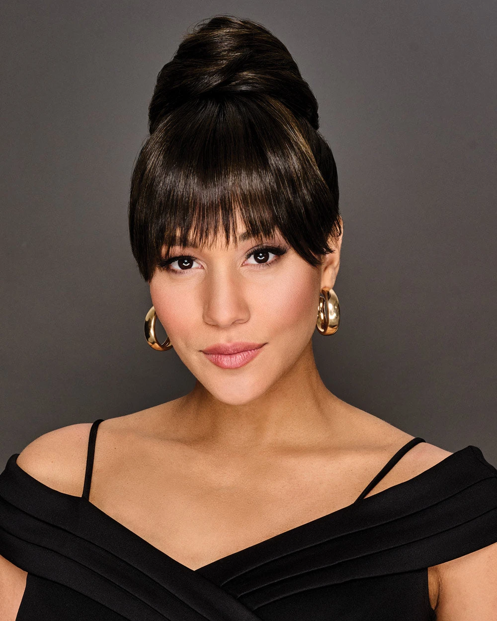 All-in-one fabulousness! Position the bangs where you like and snap in place. Then cover your baby bun with the bun hairpiece and pull the drawstring to secure. It’s a whole new look in seconds and it couldn’t be easier.